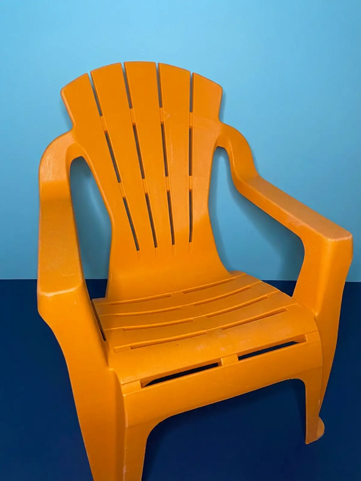 Cette chaise enfant vintage en plastique orange rappelle immédiatement les jardins des années 70 et 80. Avec sa couleur vive et ses lignes simples, elle incarne parfaitement le mobilier du quotidien de cette époque.
