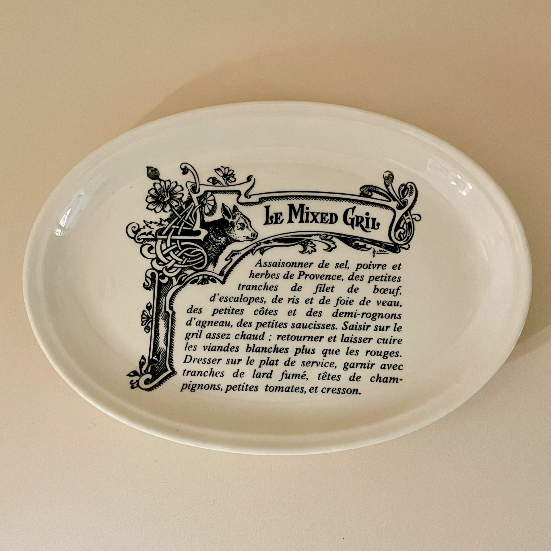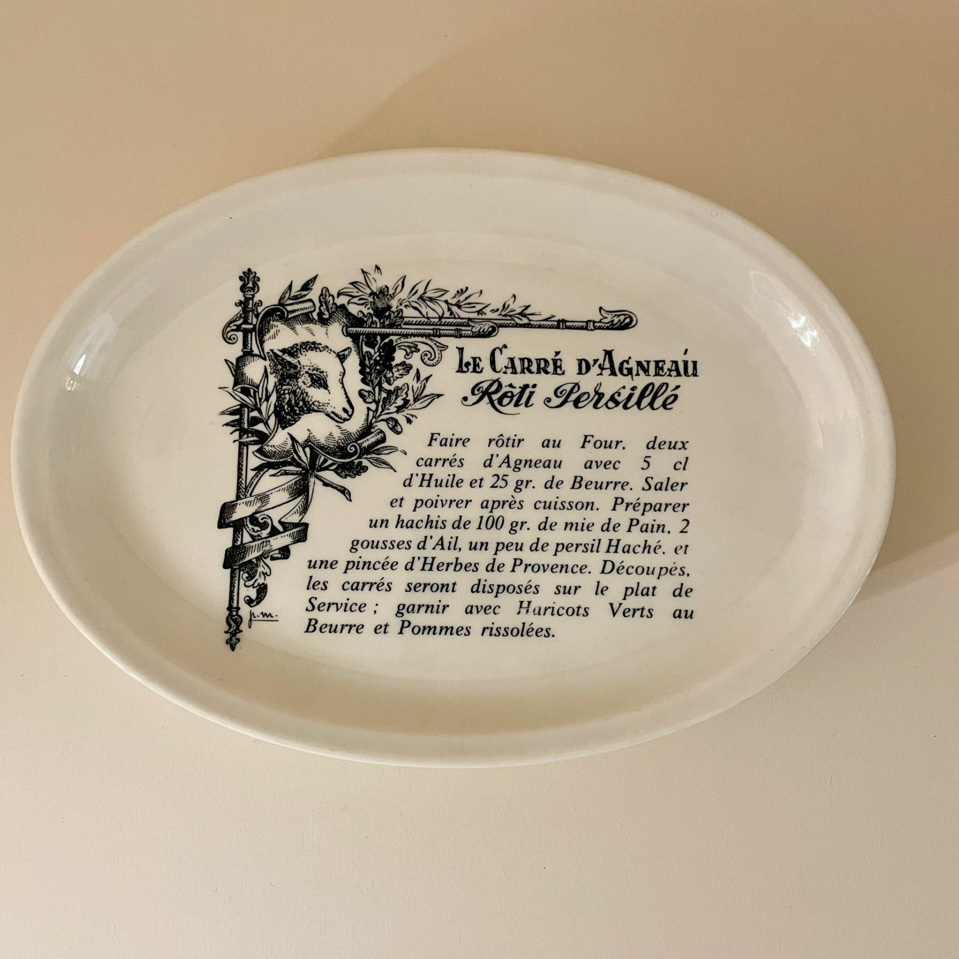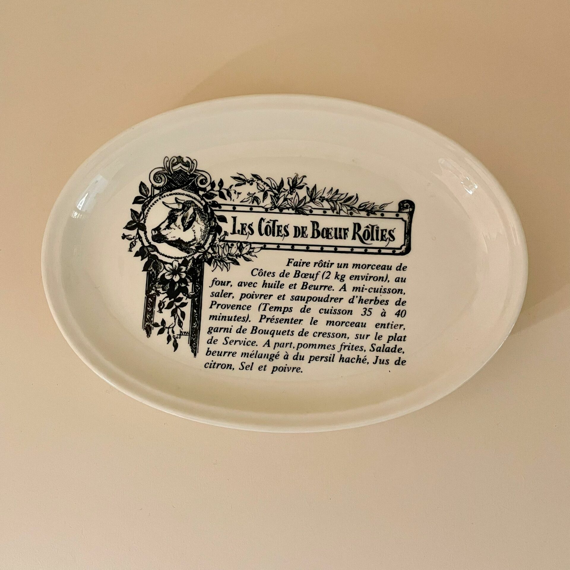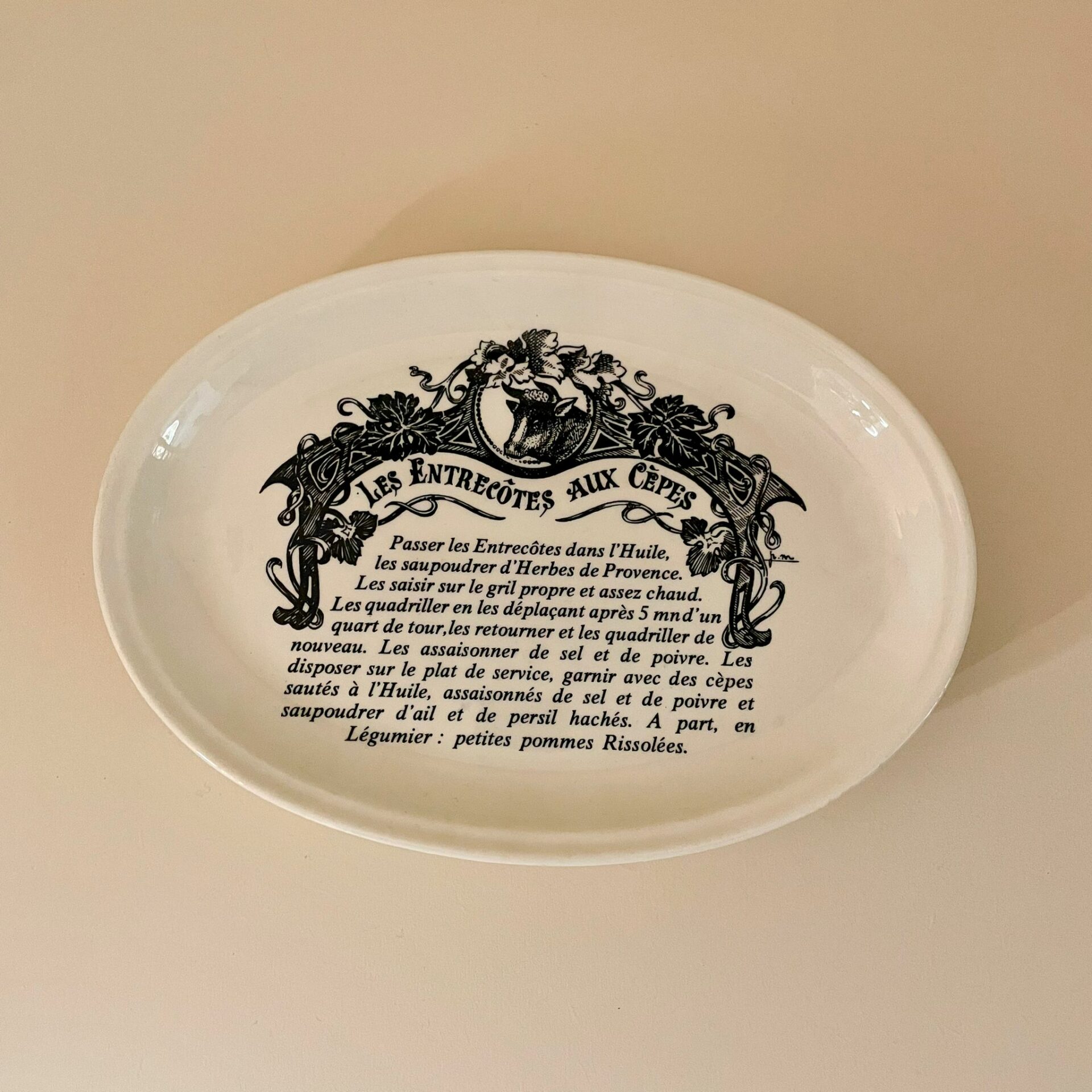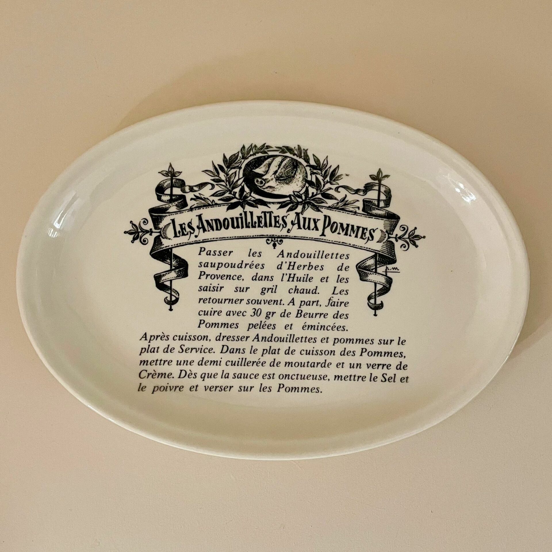 Cet ensemble d’assiettes vintage illustrées avec des recettes de cuisine évoque l’univers des bistrots et de la cuisine française traditionnelle. Avec leur décor noir sur fond blanc et leur texte culinaire, ces assiettes rappellent les services que l’on retrouvait dans les restaurants et brasseries d’autrefois.