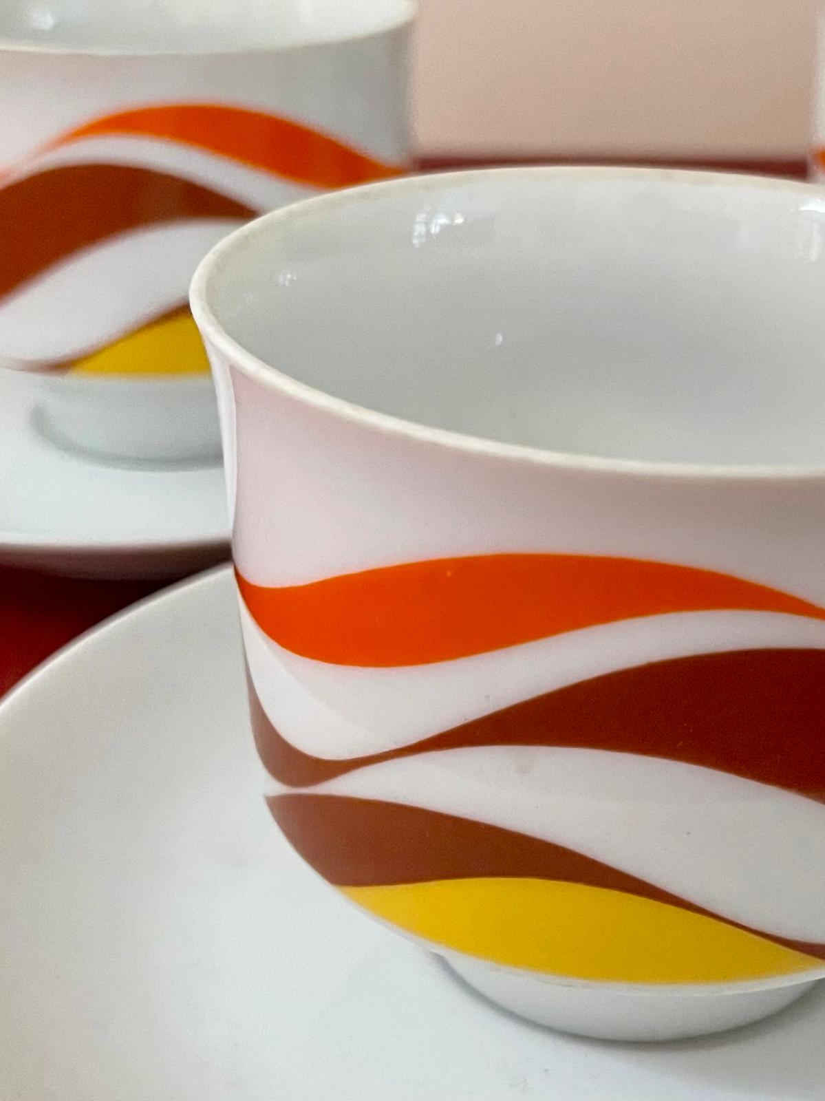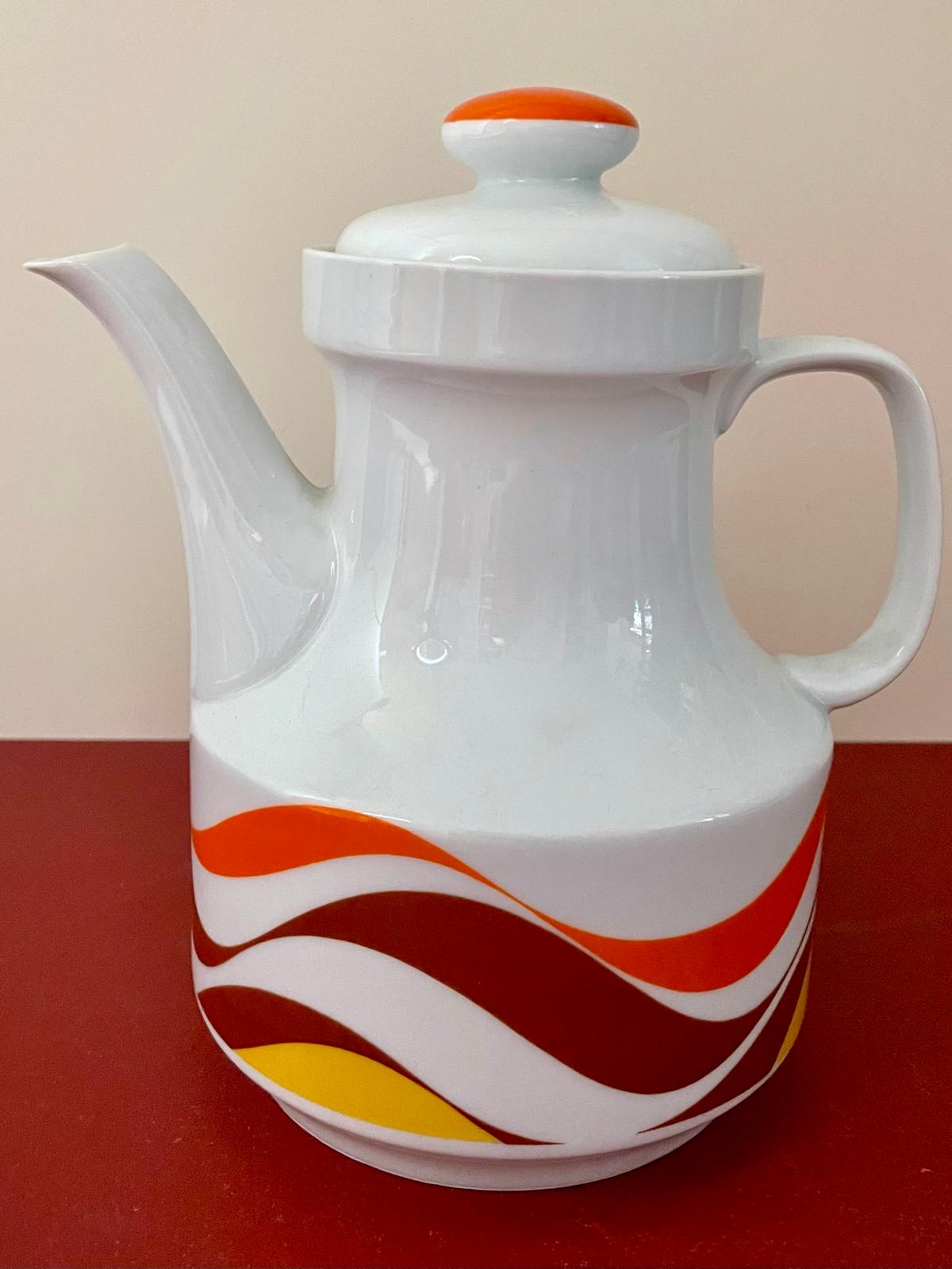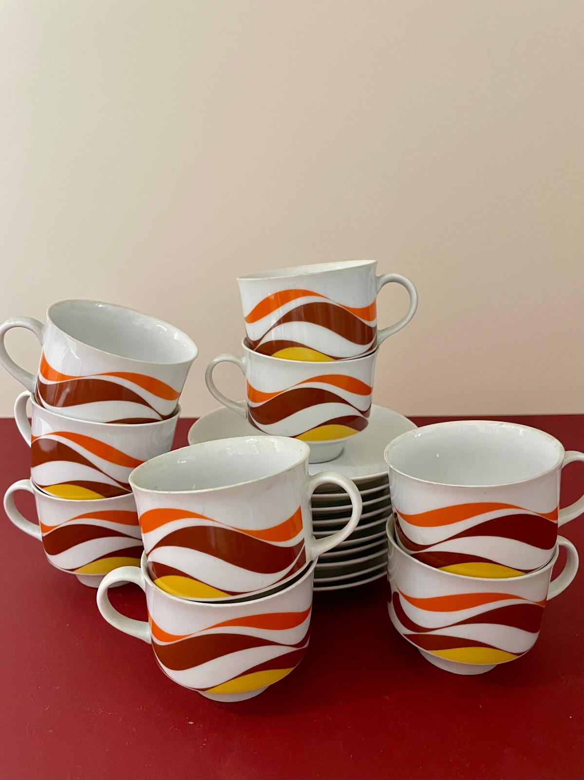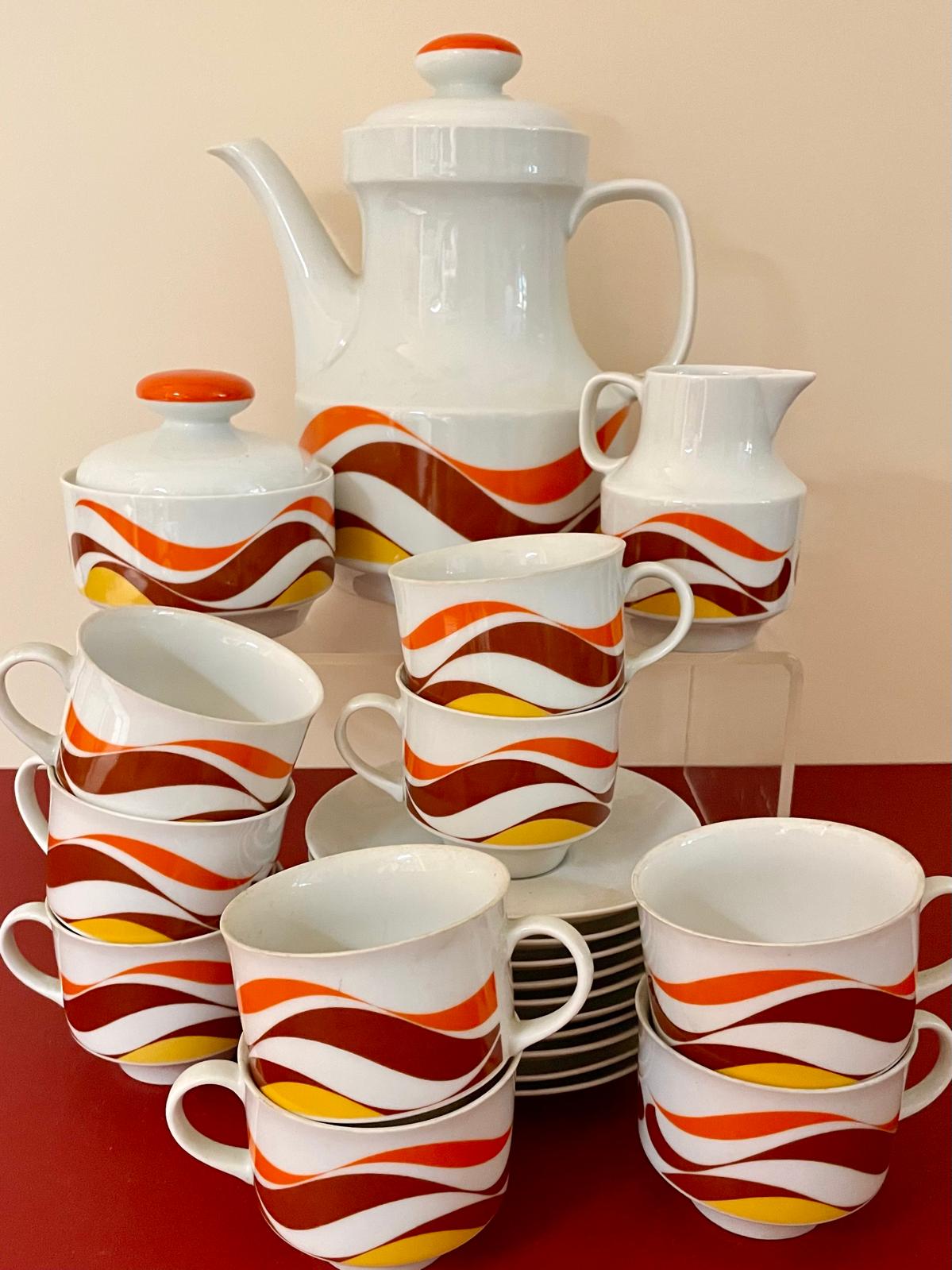 Ce service à café vintage est typique du design des années 70, avec ses motifs ondulés orange, brun et jaune qui évoquent immédiatement les cuisines colorées de cette époque. L’ensemble comprend une cafetière, des tasses avec soucoupes ainsi que les accessoires assortis, formant un service complet plein de charme.