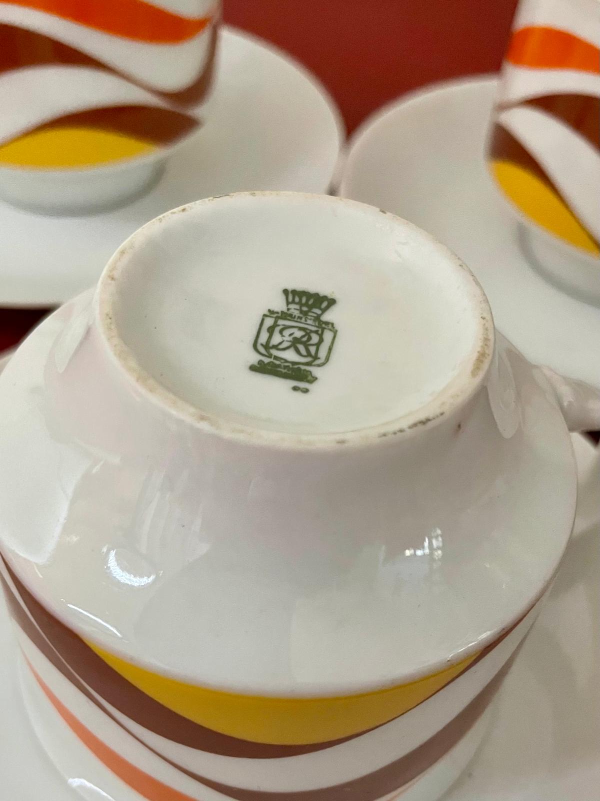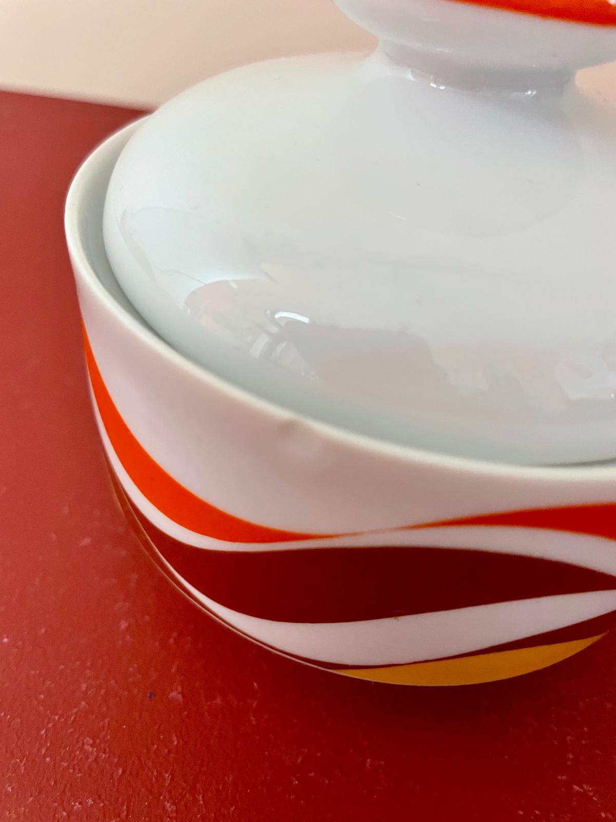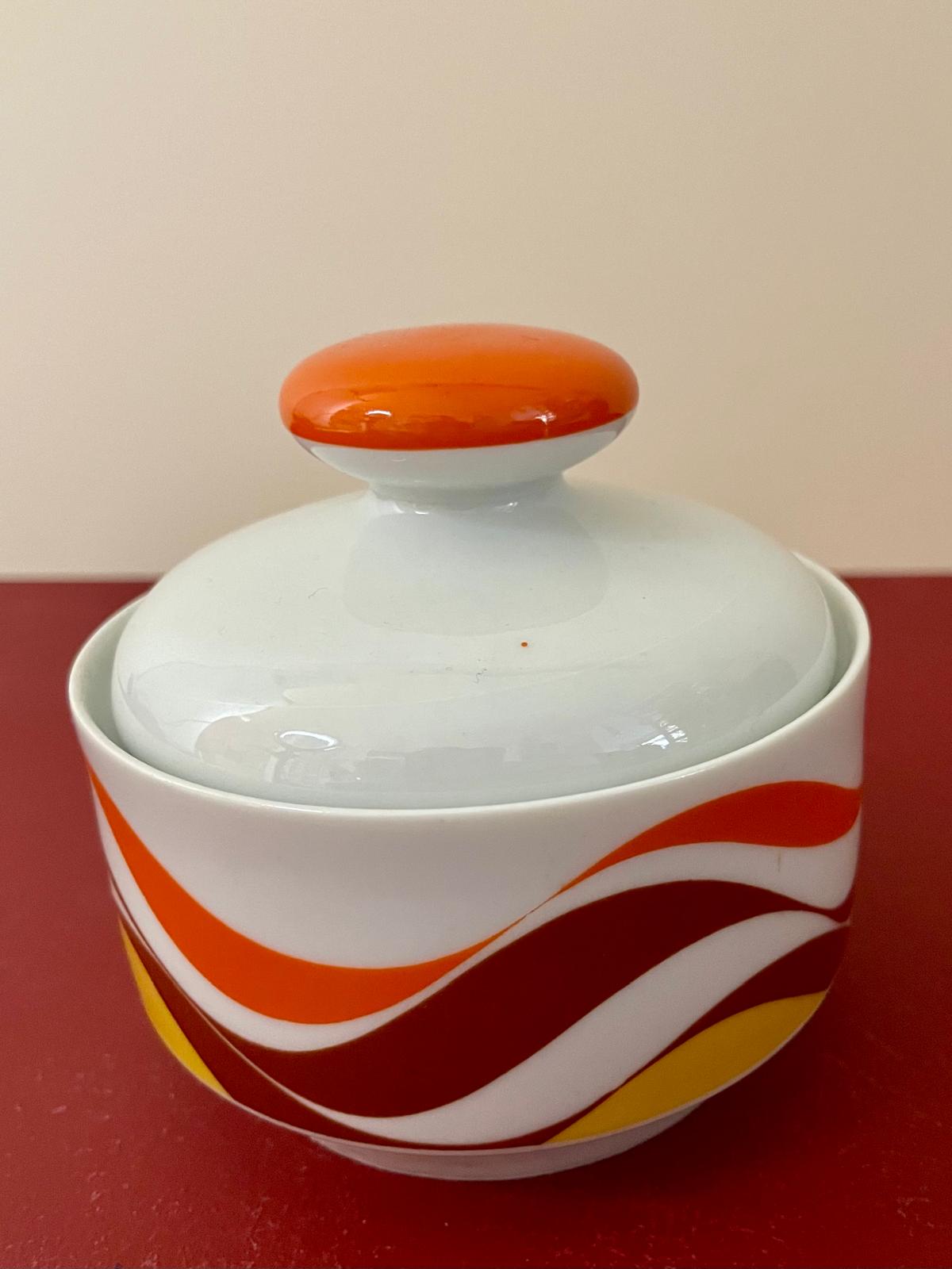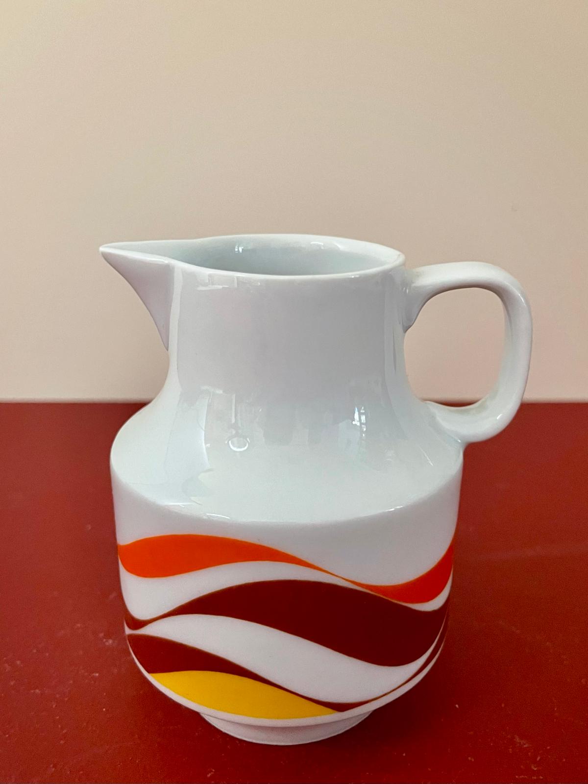 Ce service à café vintage est typique du design des années 70, avec ses motifs ondulés orange, brun et jaune qui évoquent immédiatement les cuisines colorées de cette époque. L’ensemble comprend une cafetière, des tasses avec soucoupes ainsi que les accessoires assortis, formant un service complet plein de charme.